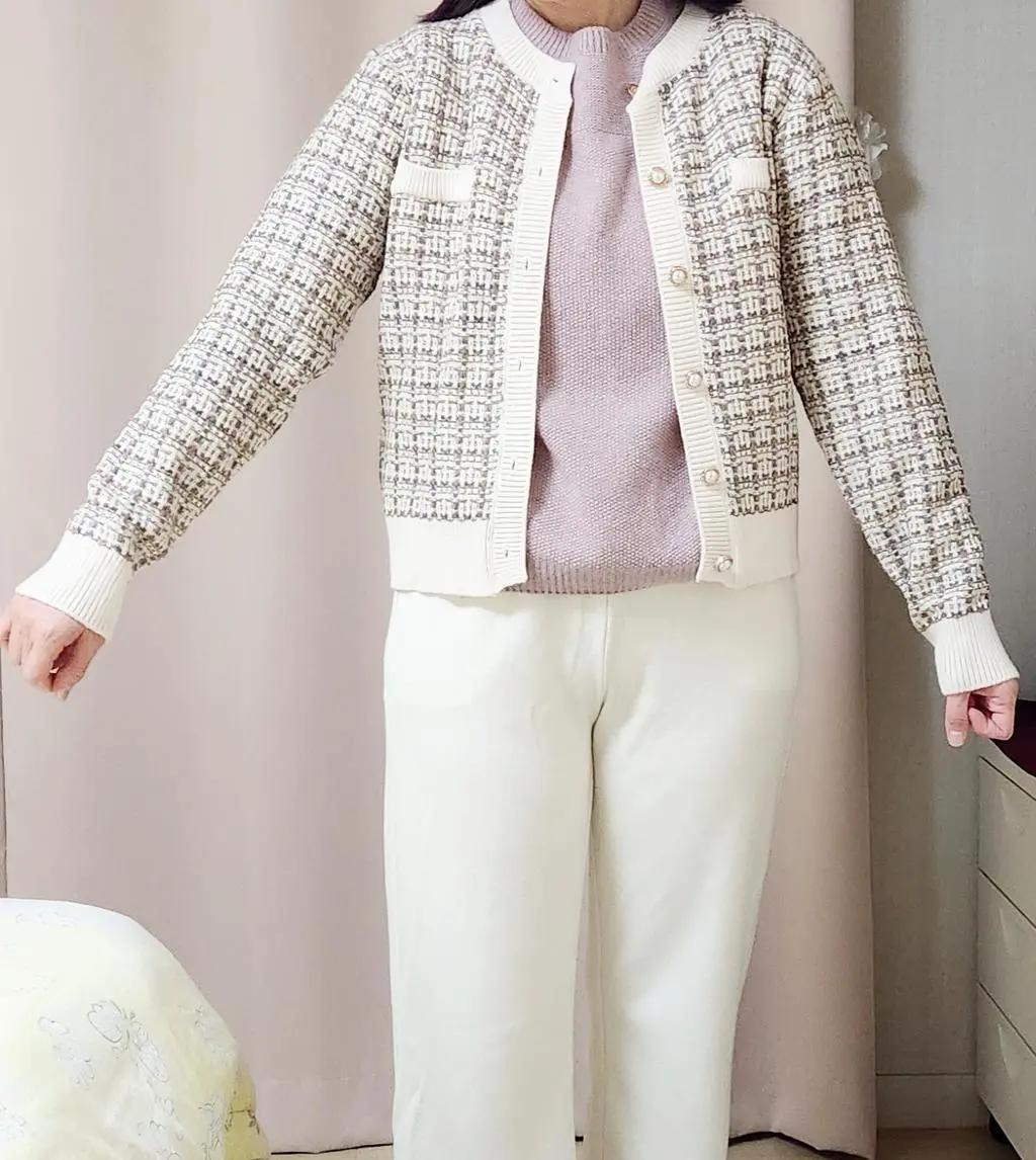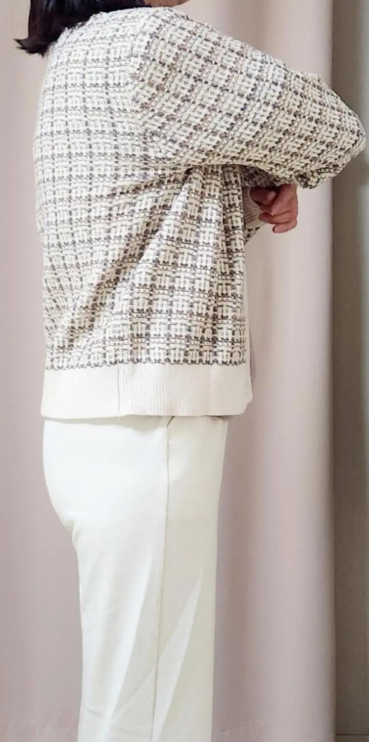 디자인이 예뻐요. 신축성은 약간 있어요. 소매가 살짝 길어요. 올 뜯길까봐 조심스러운건 있어요. 아주 얇지는 않아서 요즘 입기 좋아요. 단추가 촌스러운 금장은 아니라서 다행이네요.