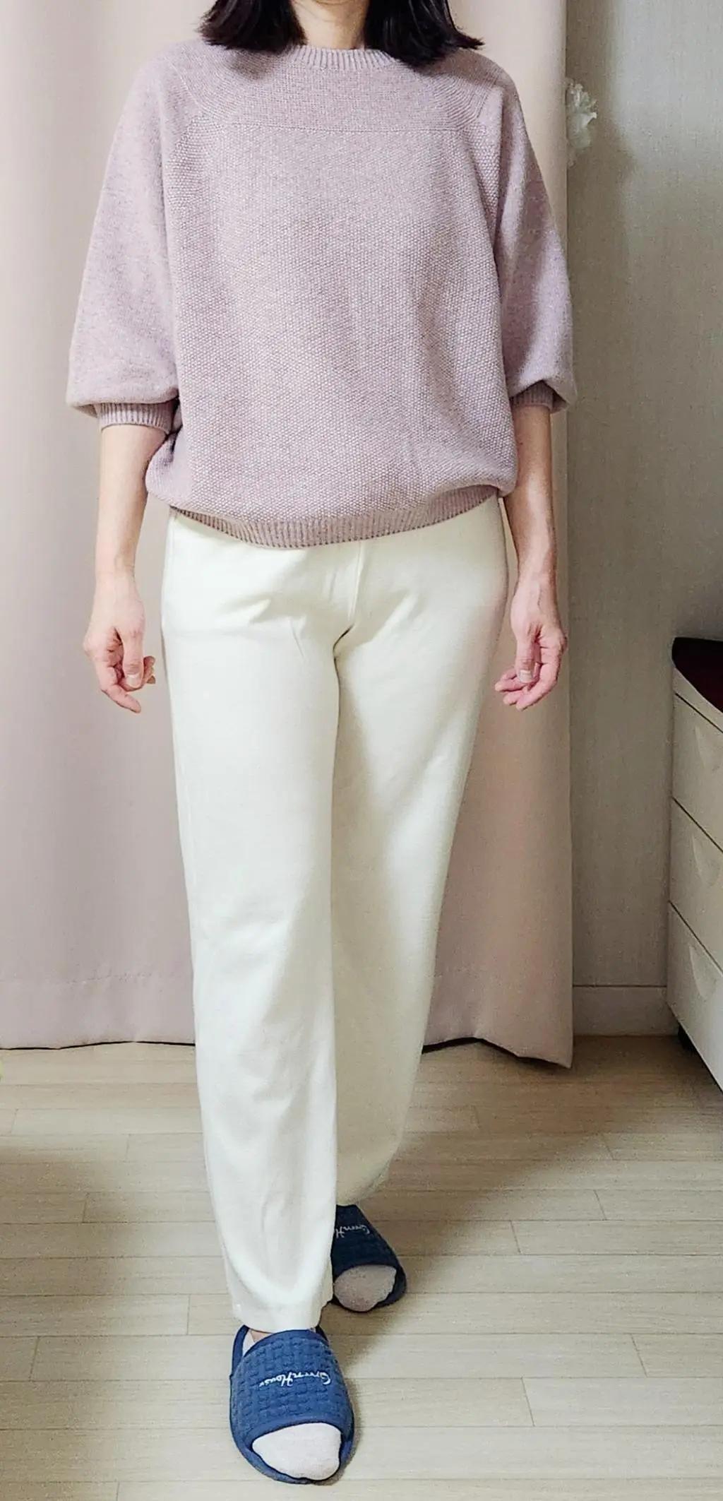 • 소매도 전체 기장도 많이 짧은 디자인이에요. 무봉제선으로 통으로 만든 니트라서 그런지 가벼워요. 보랏빛도는 핑크예요.
