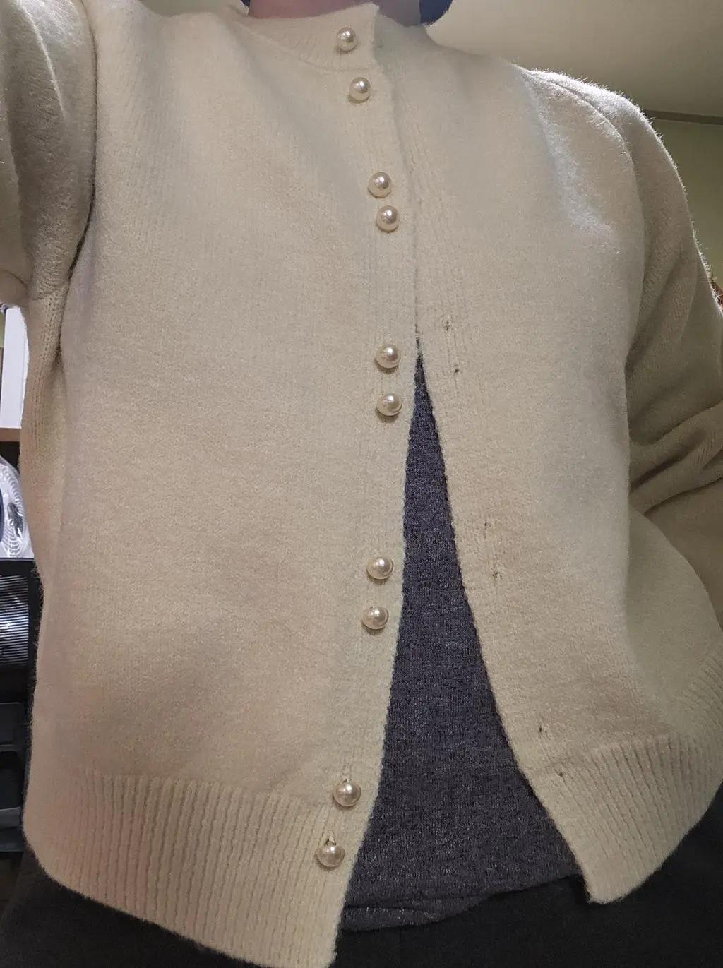 첨에는 정전기가 너무 심했는데, 섬유유연제 넣고 한 번 세탁하고 나니 좀 낫네요. 펄 단추가 포인트이고, 같이 온 스카프는 길이가 애매해서~~재질은 도톰하고 길이도 적당해서 이리저리 잘 매치가 될 거 같네요.^^