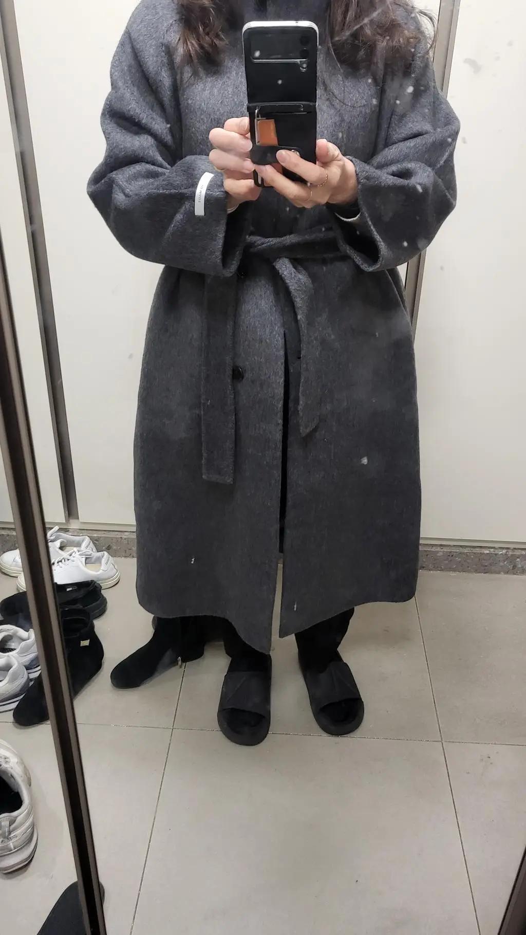 • 안감이 없어 좀 당황스럽긴한데 디자인 좋고, 따뜻해요~색상도 원하던 차콜~~단추 다 채우고 벨트 매면 고급져 보이고 날씬해 보여요~~