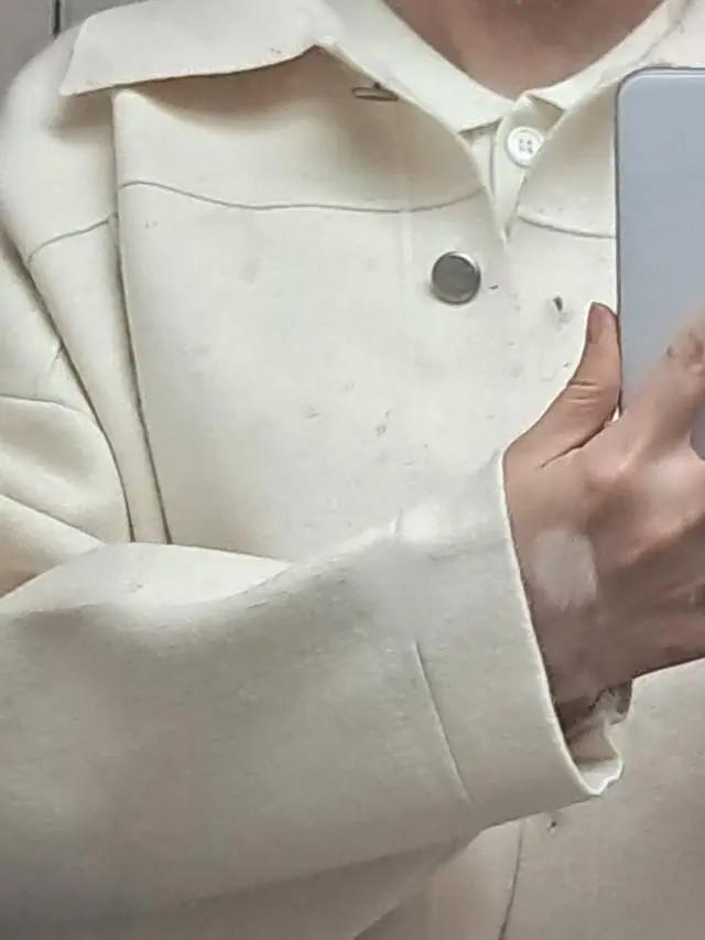 와우! 대만족이에요. 난생 첨 화이트 자켓 시도하려다가 부담되어 화이트진 자켓 찾다가 결국 무난하면서도흔하지 않은 니트 자켓을 사게됐는데, 활용도 좋고 옷도 예쁘네요. 아이보리라 색도 잘받아요. 난생첨 착용샷 올립니다~~ 사진 확대하여 부하게 나왔지만 66. 딱이에요. 단추도 사이트보다 똑똑하네요.