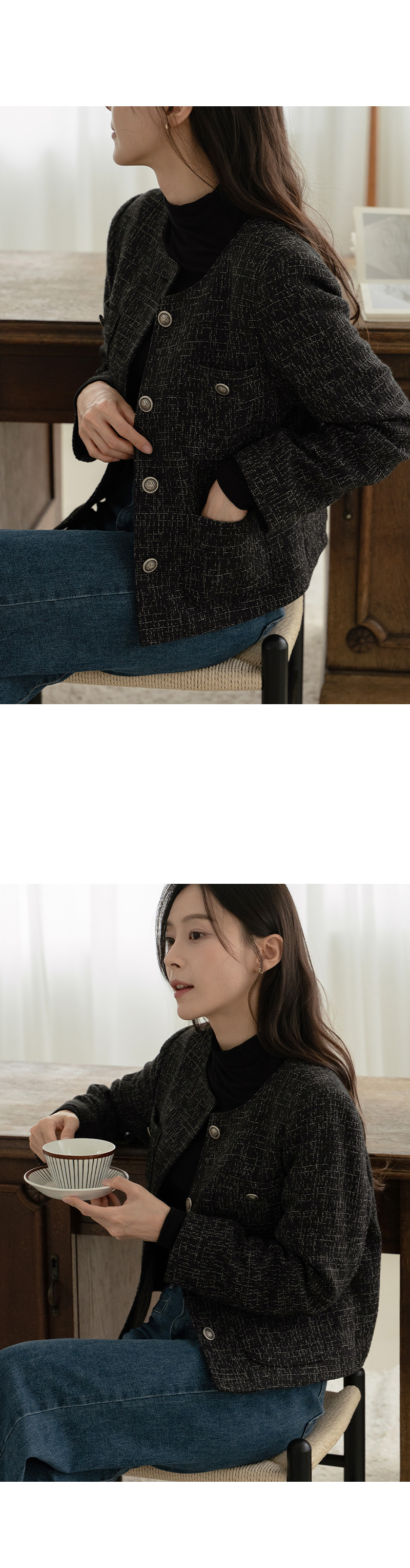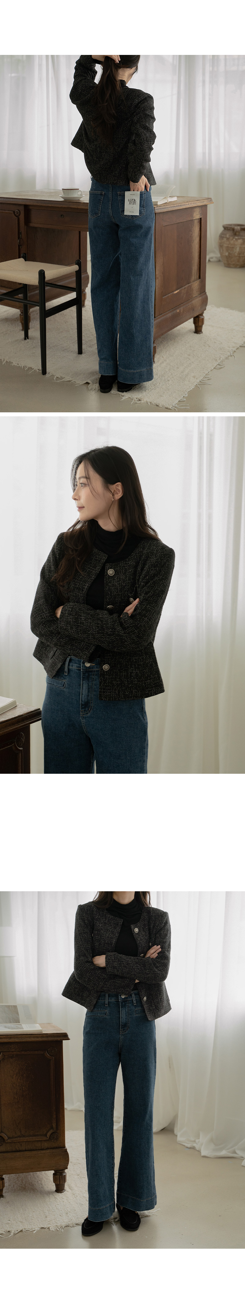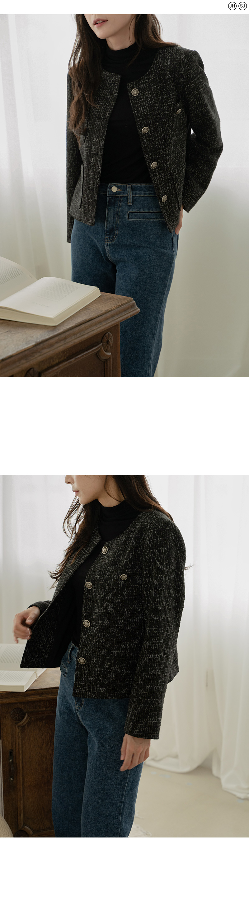 깔끔하게 트위드 자켓의 정석 핏을 연출해주는