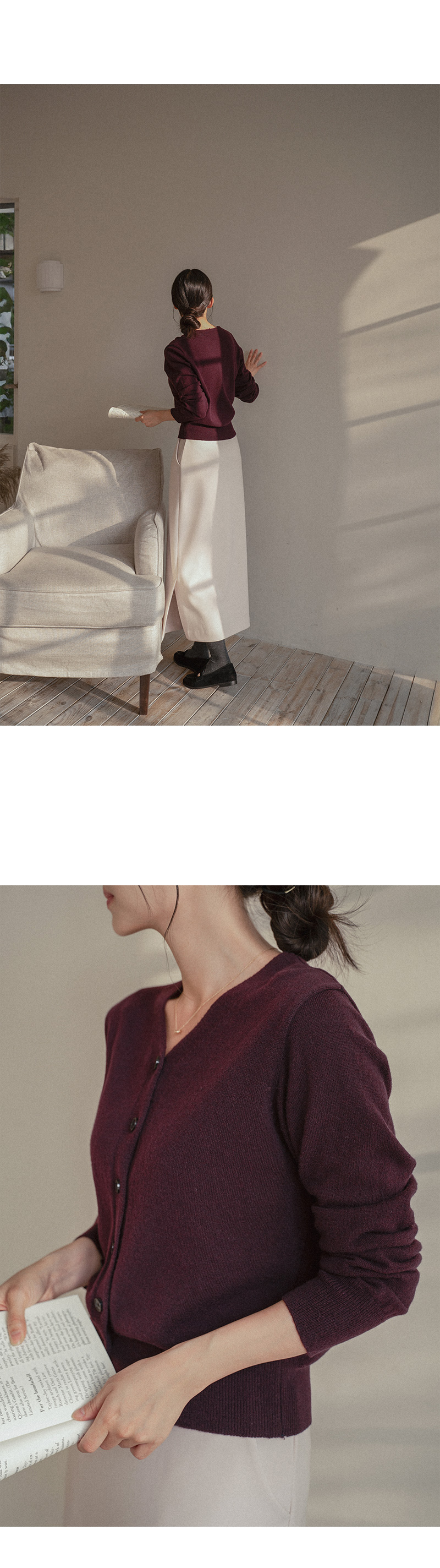파임 없이 답답함만 덜어낸 브이넥 라인으로