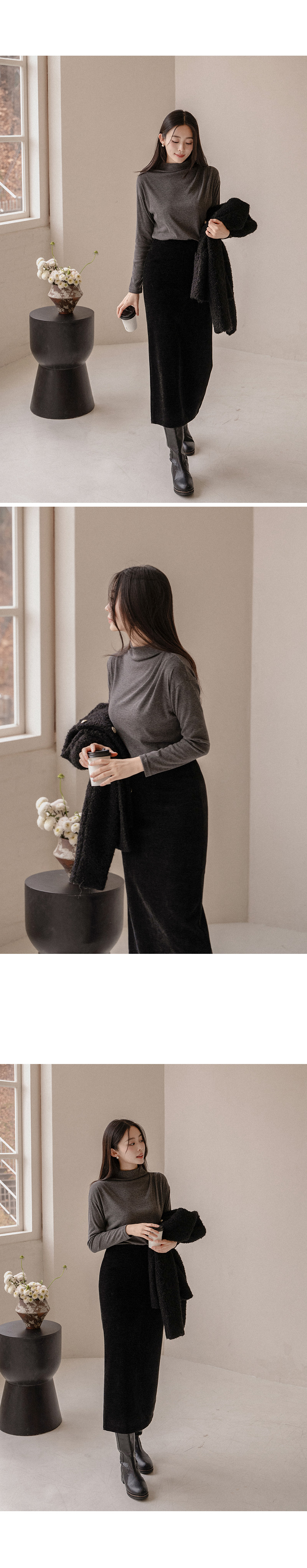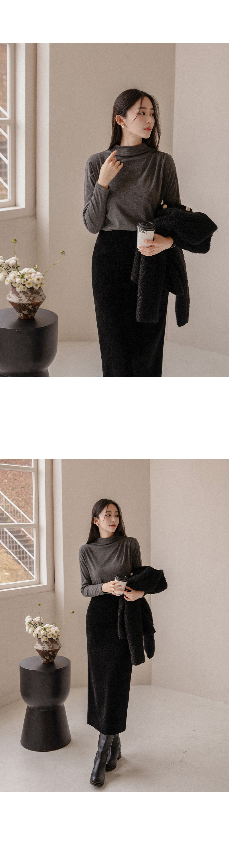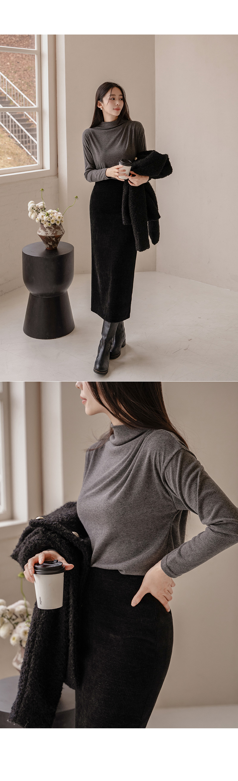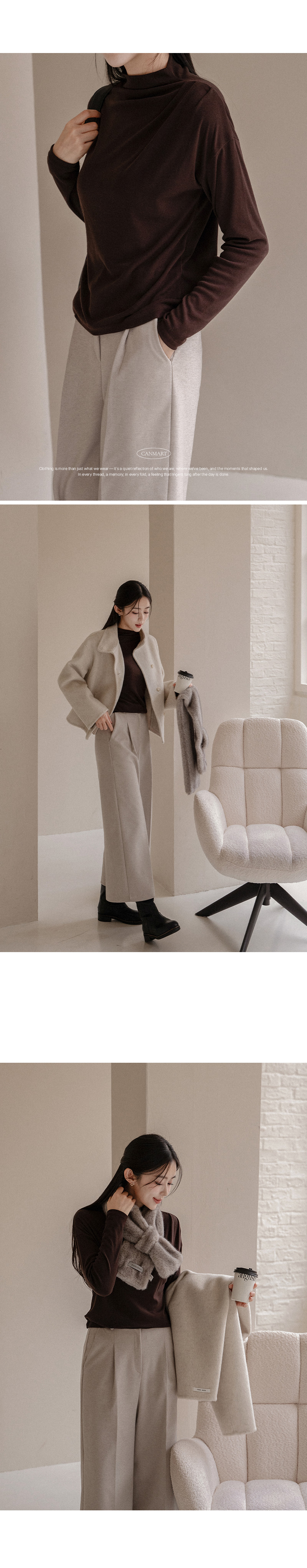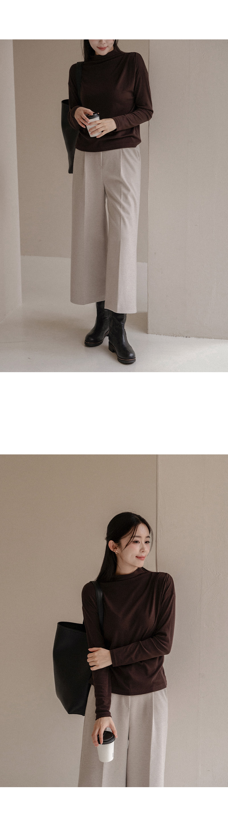 한번에 잡은 숄더 셔링 폴라 티셔츠입니다.