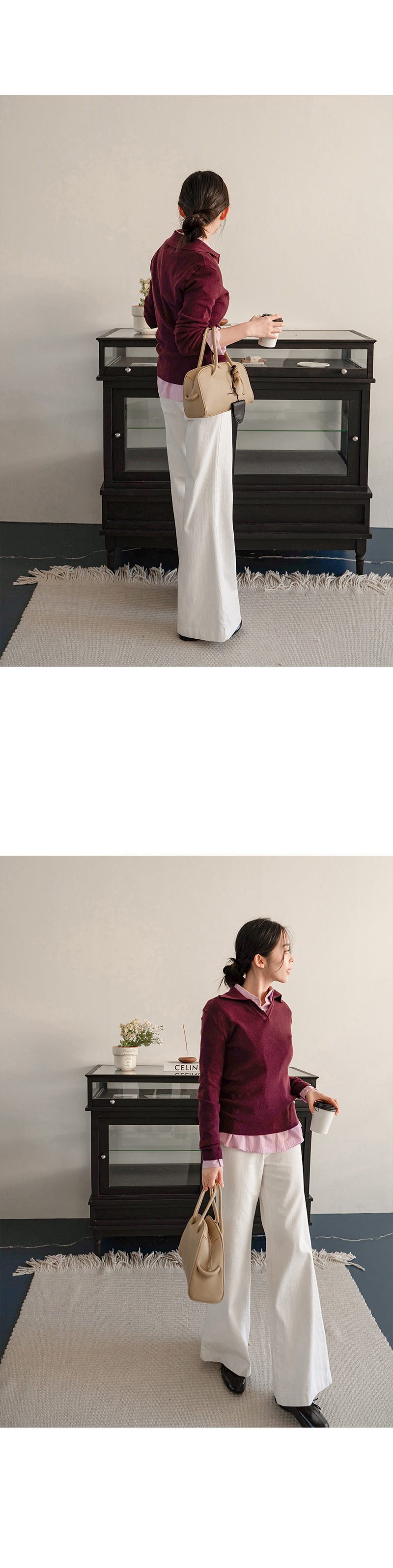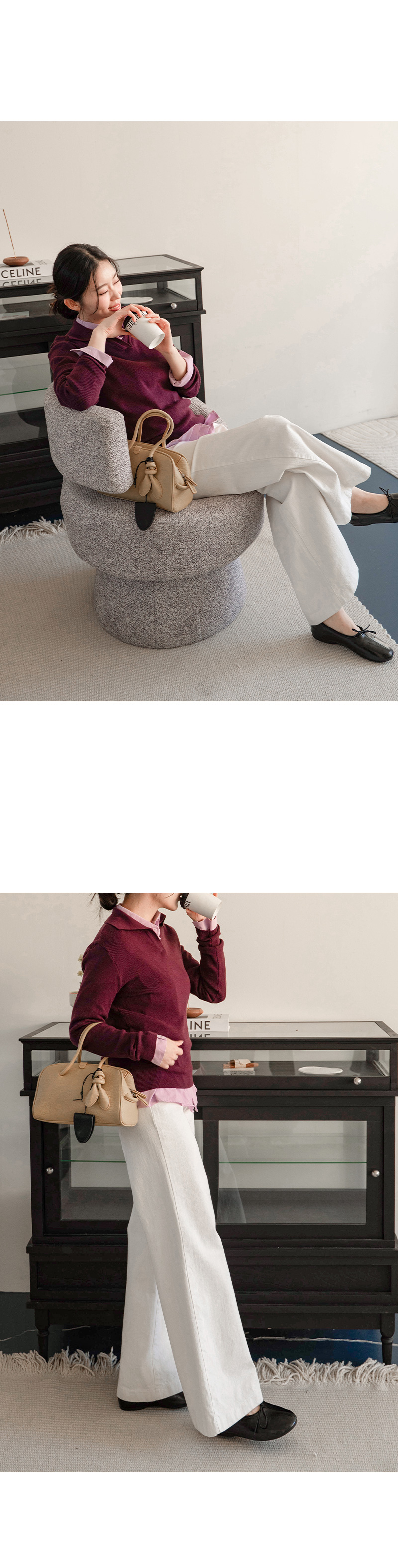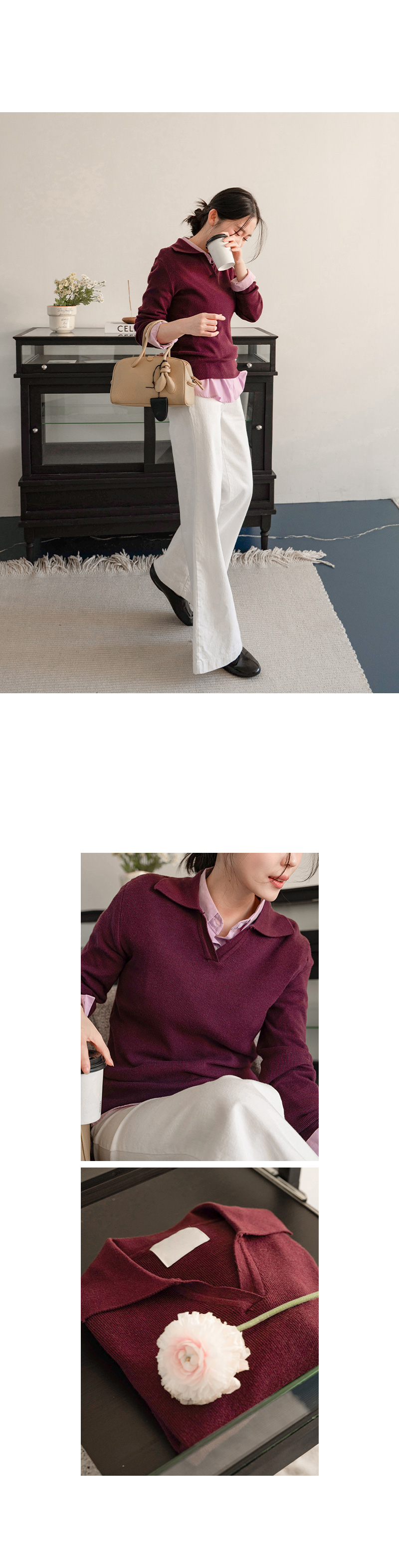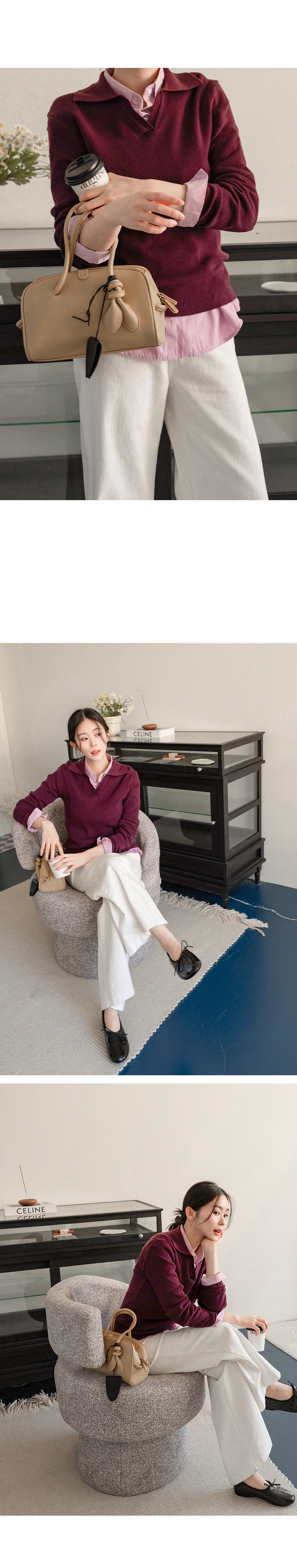 브이넥 카라 디자인으로 넥 라인 답답함 없이