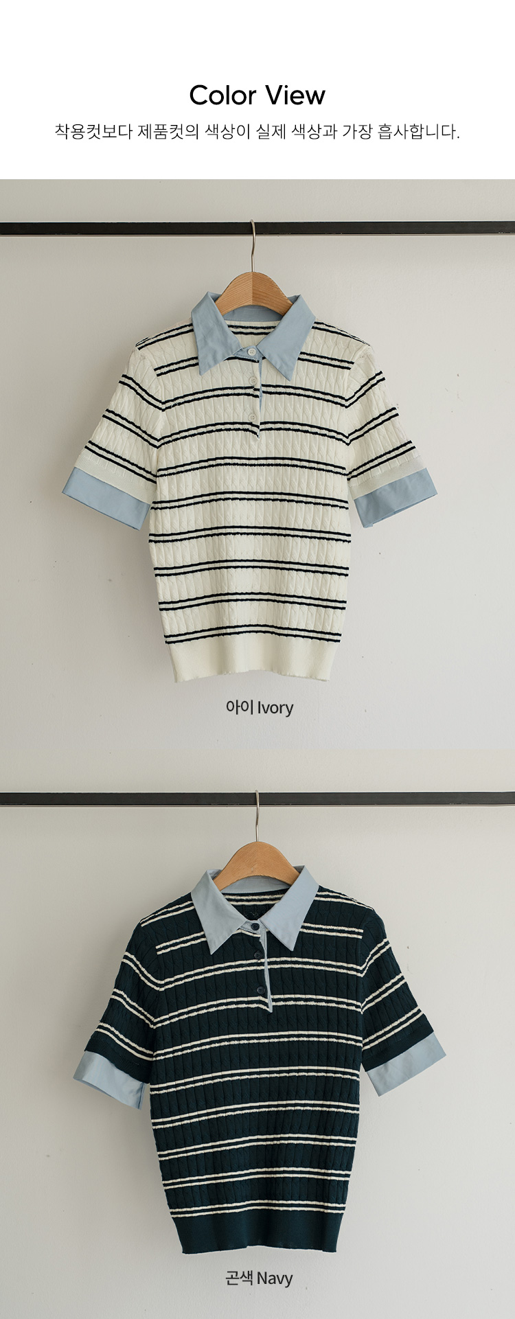 하늘색 카라와 소매 배색 디테일로